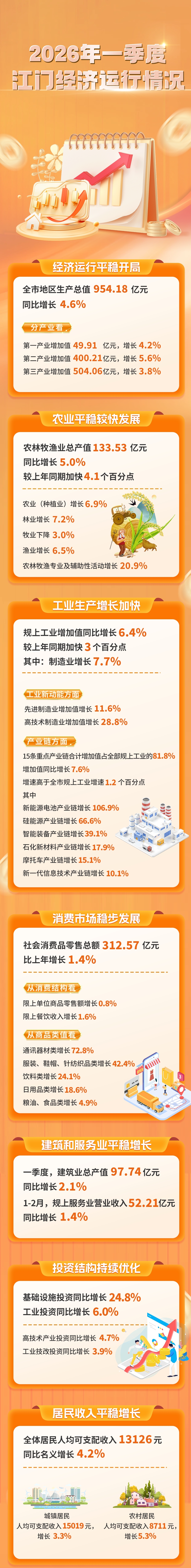 4月27日,记者从江门市统计局获悉,一季度,江门实现地区生产总值954.18亿元,按不变价格计算(下同),同比增长4.6%。分三次产业看,第一产业增加值49.91亿元,增长4.2%;第二产业增加值400.21亿元,增长5.6%;第三产业增加值504.06亿元,增长3.8%。