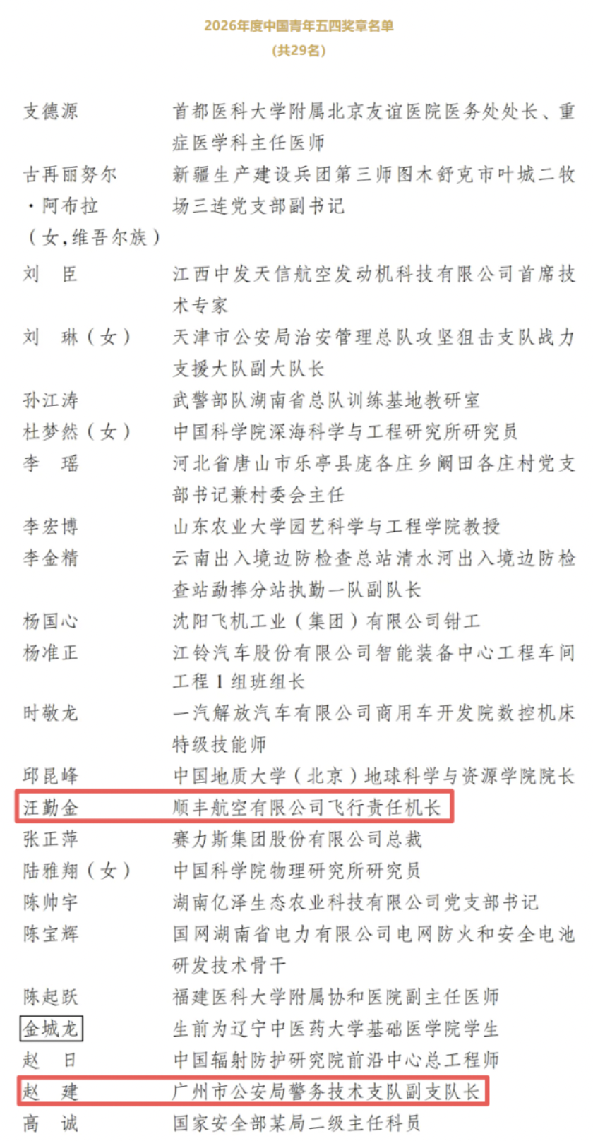 其中,汪勤金(顺丰航空有限公司飞行责任机长)、赵建(广州市公安局警务技术支队副支队长)获评2026年度中国青年五四奖章。