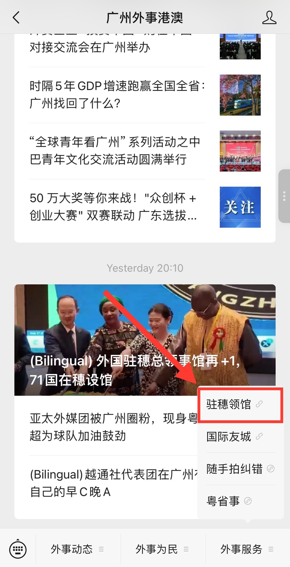 如何查询各国驻穗总领事馆的设馆情况及馆址?市民可通过广州市外办官网查询,也可在“广州外事港澳”微信公众号界面,点击右下角查询。