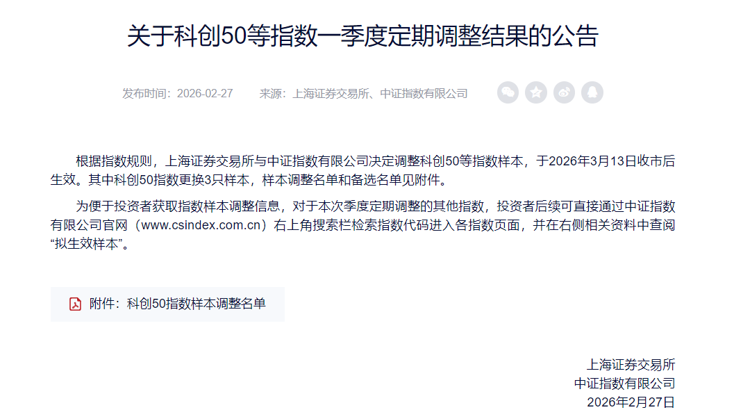 2月27日,上海证券交易所与中证指数有限公司联合发布公告称,决定调整科创50等指数样本,于2026年3月13日收市后生效。